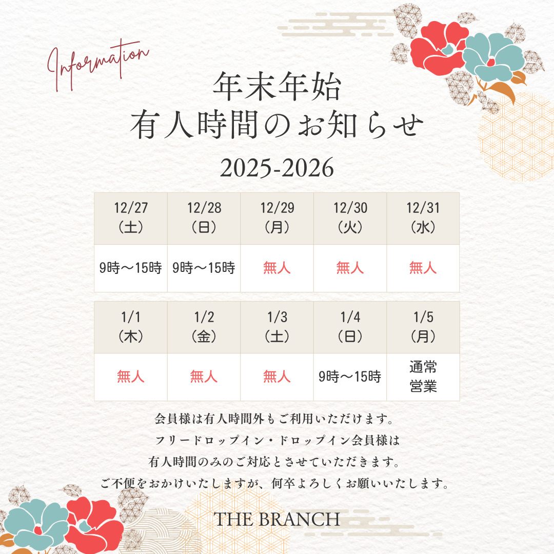 年末年始期間のスタッフ有人時間について、以下の通りお知らせいたします。