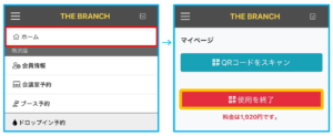 ・ドロップインメンバーの方は、退出時に使用を終了ボタンからQRコードを読み取らないと、退出時間が記録されず、最大料金が適用されますのでご注意ください。